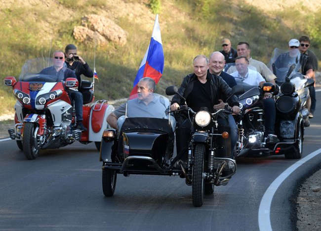 Президент РФ Владимир Путин участвует в организованном мотоклубом «Ночные волки» международном байк-шоу «Тень Вавилона» в Севастополе за рулём мотоцикла «Урал» с коляской