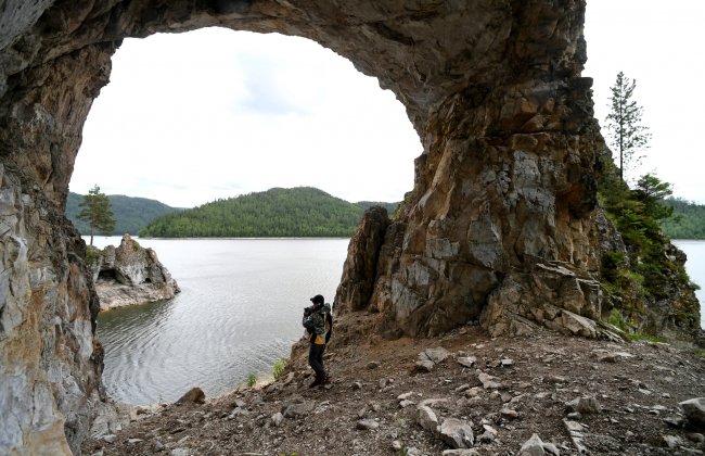 Турист в Бирюсинском карстовом створе Красноярского моря
