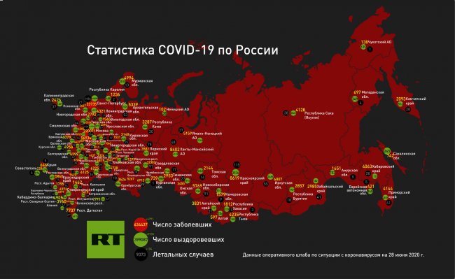 С начала эпидемии в РФ выздоровели 399 087 человек (62,9%), в том числе 5735 — за последние сутки. От осложнений, развившихся на фоне коронавирусной инфекции и сопутствующих заболеваний, скончались 9073 пациента (1,43%). За сутки умерли 104 человека.
