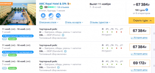 Аналогичная ситуация наблюдалась с турами в Albatros Sea World Marsa Alam. Предложение Библио-Глобуса оказалось на втором месте, но зато включало багаж.