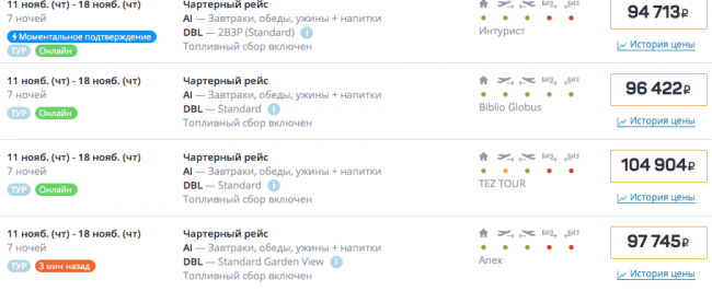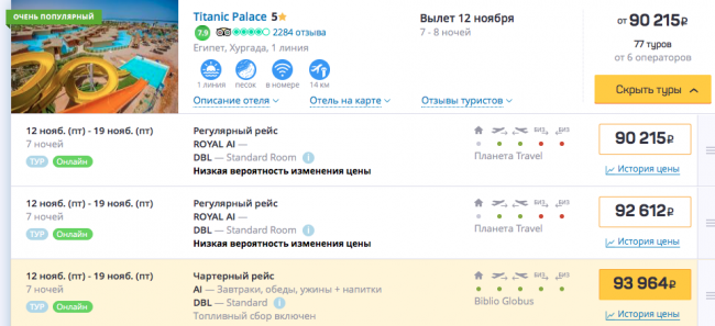 Для чистоты эксперимента корреспондент TourDom.ru проверил цены на туры с вылетом 12 ноября. По мнению эксперта чата «Источники ТурДома», лучшие условия туроператор предлагает на три отеля: Sindbad Club, Royal Albatros Moderna, Titanic Palace. В случае с Sindbad ситуация снова повторилась: наверху оказалось предложение, включающее перелет с ручной кладью.