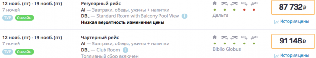 Корреспондент TourDom.ru сравнил предложения Библио-Глобуса с предложениями других туроператоров по нескольким отелям. Так, по состоянию на 17:00 пятницы наиболее доступный по цене 8-дневный тур с вылетом 11 ноября из Москвы на S7 и размещением в AMC Royal Hotel за 67 384 руб. на двоих предлагал «Интурист». Тур от Библио-Глобуса на рейсе а/к «Россия» оказался дороже менее чем на 2 тысячи – 69 172 руб. Однако нужно учитывать, что в эту цену Библио-Глобус уже включил перевозку 20 кг багажа, в то время как в попавшем в выборку предложении «Интуриста» учтены билеты с ручной кладью.