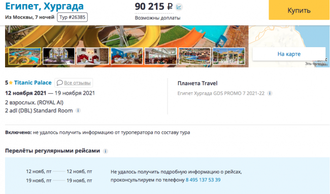Однако попытка получить конкретизацию информации по перелету провалилась – система выдала ошибку и предупреждение, что возможны доплаты. Тур в этот же отель у Библио-Глобуса стоил 93 964 руб., его можно было забронировать моментально. Таким образом, вывод очевиден: предположение о завышении цен не получило подтверждения, предложения туроператора как минимум находятся в рынке. Как сообщили в компании, среди преимуществ туров Библио-Глобуса – то, что цена указана без скрытых доплат и включает перелет авиакомпанией «Россия» с багажом 20 кг.