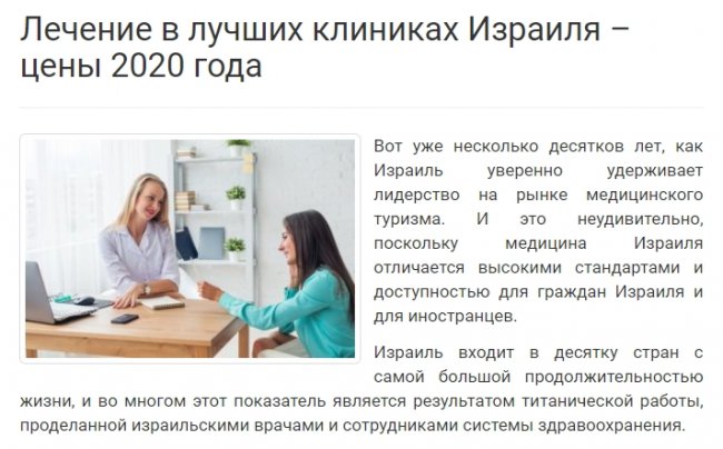 Шагающая в ногу со временем медицина, заметно сказывается на оснащении и уровне оказания услуг в клиниках Израиля тут лучшие медицинские центры. Здоровьем пациентов занимаются только высококвалифицированные врачи, являющиеся опытными специалистами в различных областях. Профессионализм, богатая материально-техническая база и относительно низкие цены на диагностические и лечебные процедуры служат основными показателями при выборе больницы за рубежом.
