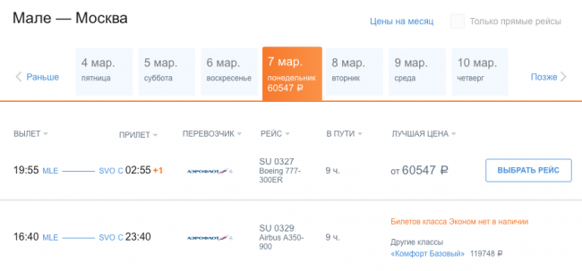 Ранее на этом направлении были доступны рейсы SU 0321 и SU 0325 с отправлением из Мале в 11:00 и 15:05. Билеты экономкласса на 7 марта вчера стоили 85 тыс. руб. По состоянию на утро воскресенья все они были раскуплены, а единственное кресло в «бизнесе» продавалось по цене около 800 тыс. руб.