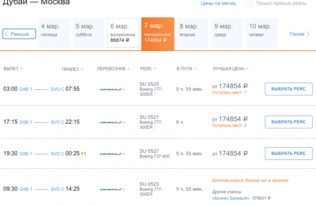На другом востребованном направлении, Дубай – Москва, у «Аэрофлота» 7 марта запланировано сразу пять рейсов. Билеты экономкласса доступны в свободной продаже по цене от 174 тыс. руб.