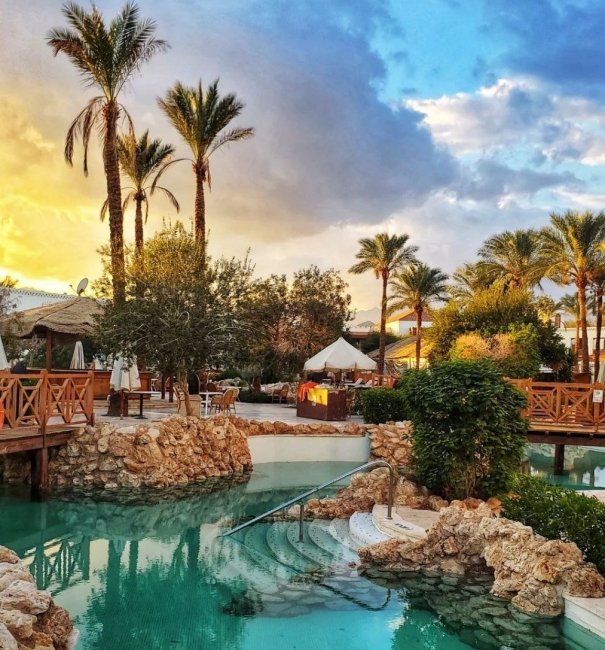 Отель расположен не на первой линии, но до пляжа идти всего 7 минут. Территория небольшая и уютная, толп нет, «много деревянного декора, зелени и водоемов». В Шарм-эль-Шейхе сейчас 40+ градусов, однако на второй день к жаре привыкаешь.