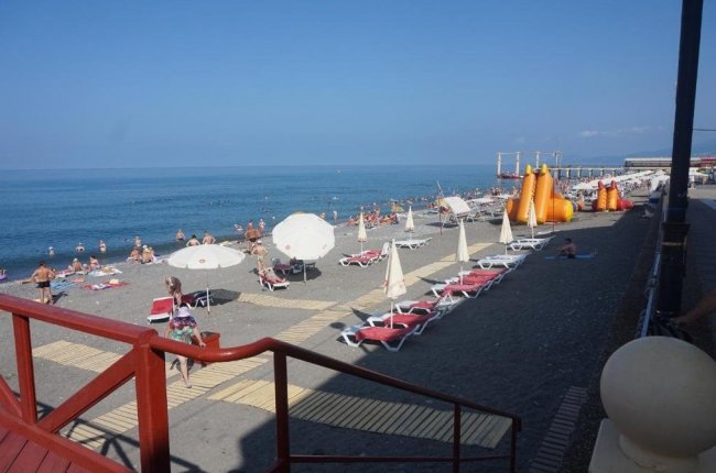 Рядом с отелем находится галечный пляж с зонтиками, лежаками и полотенцами для постояльцев. Но здесь отдыхают и посторонние, которые норовят устроиться под чужим шезлонгом: «Можно соблюдать какие-то минимальные нормы приличия и сидеть не прямо на головах друг у друга?».