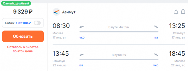 Авиакомпания «Азимут» в рамках «черной пятницы» предложила специальный тариф на билеты по маршруту Москва – Стамбул. С 11 ноября по 15 декабря перелет в этом направлении можно забронировать за 60 евро (около 3700 руб.) без учета сборов. Туда-обратно получается менее 10 тыс. руб. Цена выглядит очень привлекательно, однако на практике обнаружился небольшой подвох стоимостью 32 108 руб.