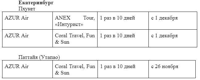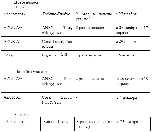 Какая перевозка на Пхукет и в Паттайю появится в конце ноября? С конца ноября рейсов в Таиланд из российских городов станет существенно больше. Собрали для вас сведения о перевозке на Пхукет и в Паттайю из четырех городов-миллионников – Москвы, Санкт-Петербурга, Екатеринбурга и Новосибирска. Информация приведена по состоянию на 22 ноября. Таблица составлена по данным новостей TourDom.ru, сайтов туроператоров, а также информации в СМИ. Редакция продолжит публикацию полетных программ в Таиланд из других российских городов.