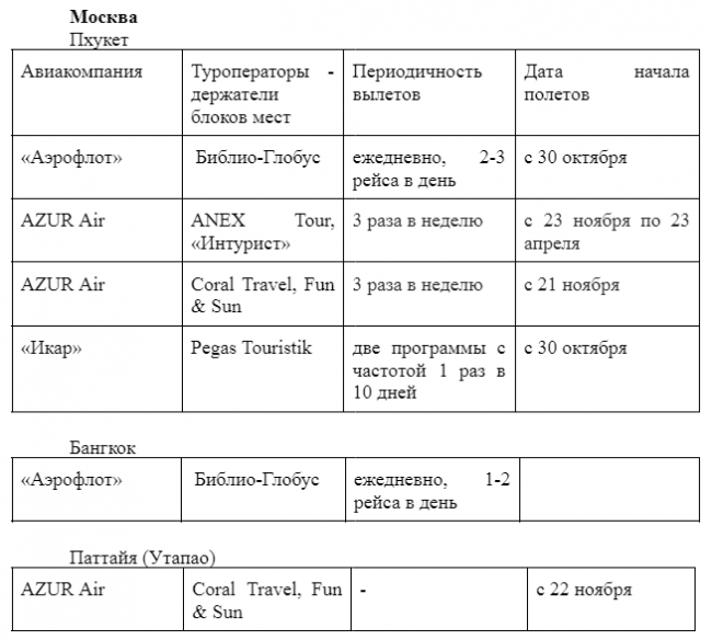 Таблица составлена по данным новостей TourDom.ru, сайтов туроператоров, а также информации в СМИ. Редакция продолжит публикацию полетных программ в Таиланд из других российских городов.