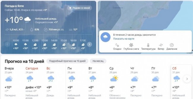 В Крыму на Новый год снега не будет. В Ялте обещают дожди и температура в праздничные дни достигнет +10 °С. В принципе, как и в Сочи. Там солнечным, согласно прогнозу, будет только 30 декабря. Из-за теплой погоды на горнолыжном курорте «Роза Хутор» даже перенесли открытие трасс на 29 декабря.