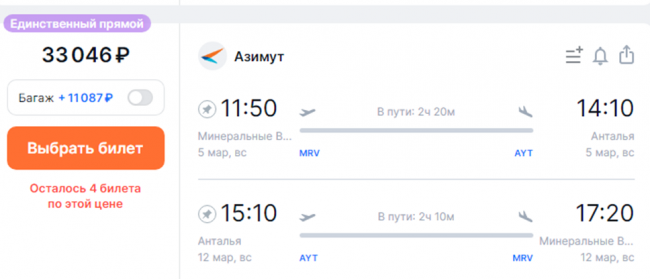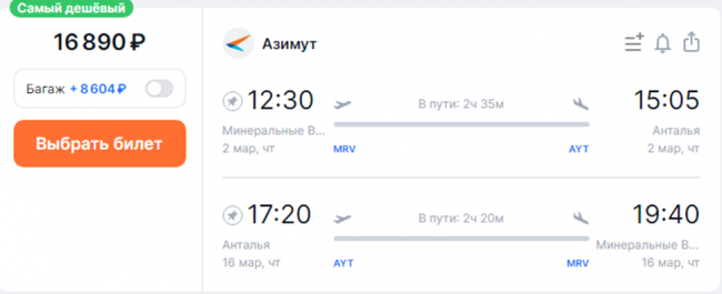Специалисты обращают внимание на низкую стоимость авиабилетов в Анталью с вылетом из Минеральных Вод в первый месяц весны. Перелет 2 марта в один конец обойдется всего в 10 тыс. руб., а билет round trip можно купить за 16 тыс., если улететь на 2 недели. Такие цены выставила авиакомпания «Азимут», которая начнет летать по маршруту с марта. В стоимость включен провоз ручной клади, за багаж придется доплатить 8 тыс. руб.