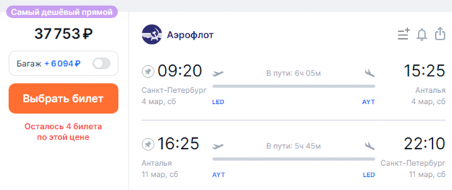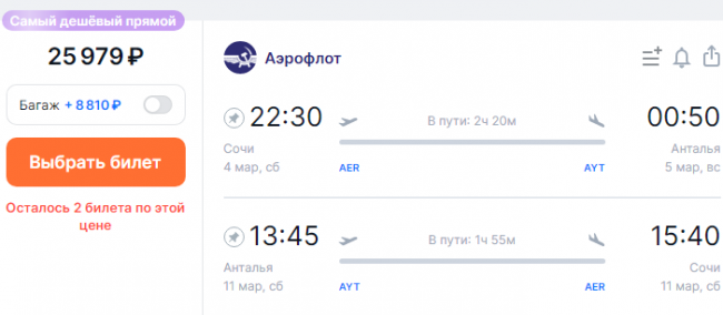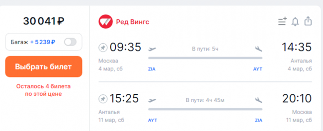 Билеты на рейсы из Москвы в Анталью можно купить по более высоким ценам. В мартовские даты их можно забронировать как минимум за 22 тыс. руб. А если туристы захотят отдохнуть с 4-го по 11-е, за перелет придется отдать от 30 тыс. руб. По такой цене доступны места на бортах авиакомпании Red Wing, но они уже заканчиваются.