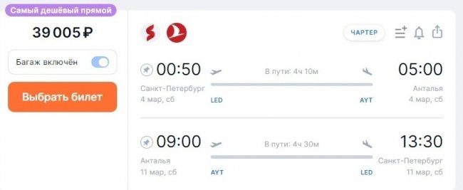 Недорого можно отдохнуть в отелях 5* Авиабилеты в Турцию на 8 Марта ожидаемо дорожают. При этом стоимость некоторых туров стоит дешевле перелета. Например, 7 ночей в бюджетном First Class Hotel 5* в Аланье на завтраках обойдутся в 25,3 тыс. руб. с человека. Лететь предлагают на самолетах Turkish Airlines 3 марта из столичного Внуково. Кресла туда-обратно на эти же даты стоят около 28 тыс. руб. на бортах IrAero и Pegasus. Как российскому туристу попасть в Пакистан Маршруты авиаперелетов, правила въезда, достопримечательности Авиавласти России и Пакистана ведут переговоры об организации прямых рейсов. Как пишут подписчики «Крыши ТурДома», в 90-х это направление пользовалось неплохим спросом среди шоп-туристов: в Карачи ездили за изделиями из кожи. HotLine.travel Читайте также - Для того, чтобы поднять настроение и зарядиться положительной энергией на целый день рекомендуется смотреть красивые картинки. Пейзаж маслом посмотреть. Из Казани аналогичный тур в этот же отель, который, по словам некоторых туристов, больше похож на пансионат, немного дороже. Так, за одного человека нужно заплатить 26,5 тыс. руб. В данном случае стоимость кресел в Анталью туда-обратно 3 и 10 марта на борту Turkish Airlines с багажом тоже выше – 30 тыс. руб. Самая существенная экономия получается для питерцев. Цены перелета туда-обратно 4 и 11 марта – от 39 тыс. руб. В то время как за тур в бюджетный пятизвездочный отель с завтраками нужно заплатить от 28 тыс. руб. С Екатеринбургом ситуация другая. Из столицы Урала перелет в Анталью 3 и 9 марта на рейсах Southwind выйдет дешевле, чем тур в пятизвездочный Drita Hotel, хоть и незначительно. Места в самолете стоят 33,5 тыс. руб., а отдых в гостинице плюс завтраки – от 37,8 тыс. руб. Если рассматривать отели попроще, то можно найти предложения от 31 тыс. руб., но без питания вовсе.