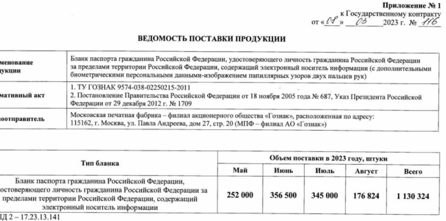 Общий объем контракта в 2023 году составляет 1,13 млн бланков. При этом период с сентября по декабрь в договор не входит. Всего на закупку паспортов с электронным носителем МВД направит более 2,3 млрд руб. Таким образом, изготовление одного бланка обойдется ведомству в 2052 руб.