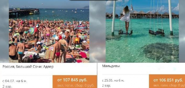 В соцсетях туристы обсуждают картинку со сравнением отдыха в Сочи и на Мальдивах: цены якобы одинаковые, а качество разное. На фото – переполненный пляж на черноморском курорте и идиллия в уединении на островах. Редакция TourDom.ru разобралась, почему сопоставление некорректно.