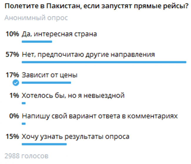 Впрочем, примерно треть – 27% – готовы отправиться в Пакистан, хотя из них 17% полетят, если будут приемлемые цены на перелет. Однако в приемлемых тарифах есть сомнения. «Вопрос в цене. С Pegasus вряд ли будет сравнимо», – пишет подписчик.