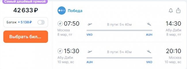 На 8 марта из Москвы в Абу-Даби минимальный тариф у «Победы» – 42 тыс. руб. и 5 тыс. руб. – доплата за багаж. Отправление в ОАЭ ранним утром, обратно – 10 марта во второй половине дня.