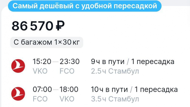 В частности, перелет Turkish Airlines из Москвы в Рим со стыковкой в Стамбуле обойдется в апреле в 86 тыс. руб. и займет 9–10 часов.