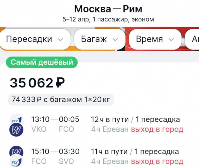 Более экономичный маршрут – из Москвы в Ереван авиакомпанией FlyOne Armenia, а далее в Рим лоукостером Wizz Air. Такой билет предлагается за 36 тыс. руб. Пассажиры проведут в воздухе 11–12 часов.