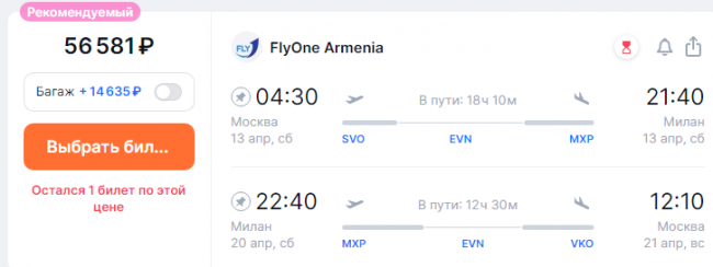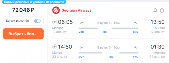 Авиабилеты на рейсы FlyOne Armenia в Милан из Москвы в апреле можно купить за 56 тыс. руб. Перелет Georgian Airways через Тбилиси обойдется дороже – 72 тыс. Но этот вариант удобнее – перелет займет всего 9 часов.
