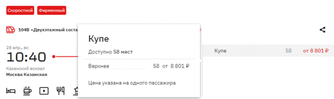 Наиболее удобен для путешествующих фирменный 2-этажный поезд 104В: он отправляется с Казанского вокзала в 10:40 и прибывает в Адлер в 09:40 (время в пути 23 часа). А значит, у туристов весь день впереди. На самую популярную дату – 28 апреля – в наличии осталось 58 купейных мест в этом составе, и все они верхние.