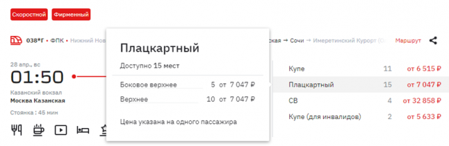 В названных поездах нет плацкартных вагонов, и туристы, предпочитающие более экономичный вариант проезда, обычно выбирают другой состав – 038*Г. Он тоже фирменный и скоростной (время в пути 1 день 7 часов), к тому же отличается удобным прибытием в Адлер – в 08:48. Однако на 28 апреля нижние места в плацкарте в этом поезде уже распроданы, верхних тоже осталось не так много – всего 15.