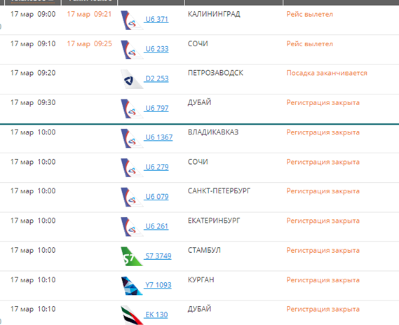 На 3 часа задерживается рейс «Якутии» в Сочи: вместо 09:50 отправление из Внуково перенесли на 13:00. Рейс Utair в Баку отложили на 2 часа, вылеты авиакомпании «Победа» в Дубай и Калининград – на 1,5.
