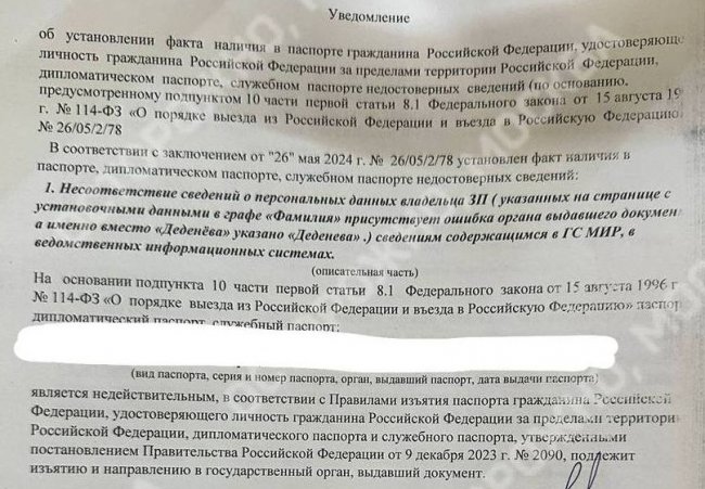 Как рассказала девушка телеграм-каналу «Осторожно, Москва», в загранпаспорте она фигурировала как Деденева, а в системе миграционного учета – Деденёва. В результате было признано, что паспорт содержит недостоверные сведения и подлежит изъятию. «Передо мной в такую же ситуацию попала семья из пяти человек, троим аннулировали паспорта из-за ошибки в отчестве Семёнович», – добавила Мария.