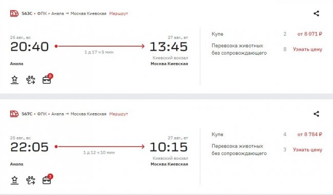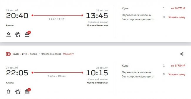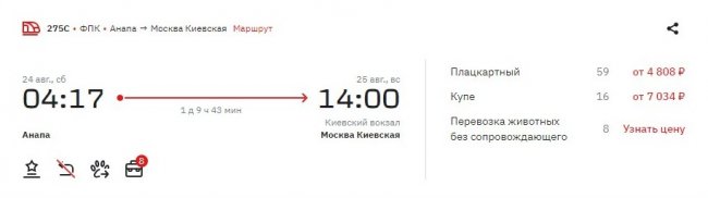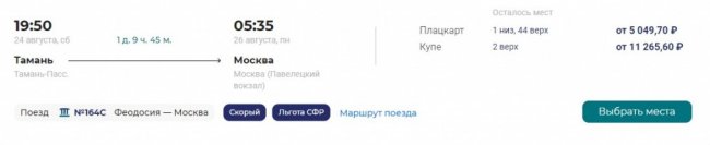Мы проверили наличие билетов на сайте РЖД. Действительно, единственным доступным вариантом на 24 августа оказался состав, выходящий из Анапы в 04.17. На него есть 16 билетов в купе стоимостью от 7 тыс. руб. и 59 – в плацкартные вагоны - от 4,8 тыс. руб. (здесь и далее указаны наличие и цены, актуальные по состоянию на 18:00 10 июня. – Ред.).