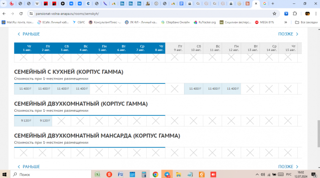 Например, в популярном пансионате Volna Family Resort одноместный стандарт по цене около 8 тыс. руб. за ночь на начало августа забронировать можно. С семейным двухместным номером без балкона (от 11,4 тыс. в сутки) уже сложнее, а если есть балкон (от 13 тыс. руб.), то трудности усугубляются. При этом семейный номер с кухней на несколько дней и вовсе не снять – для бронирования доступны только отдельные даты.
