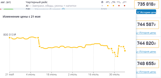 Тур в Gloria Serenity Resort 5* с вылетом из Толмачево 10 августа в конце мая предлагался за 800 тыс. руб., теперь выставлен на продажу за 735 тыс., т. е. на 8% дешевле.