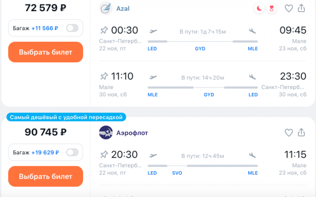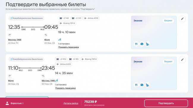 Корреспондент TourDom.ru изучил цены. Если лететь из Москвы 22 ноября и вернуться из Мале 30-го, то на сайте Azal билет по самому экономичному тарифу обойдется в 75 239 руб.
