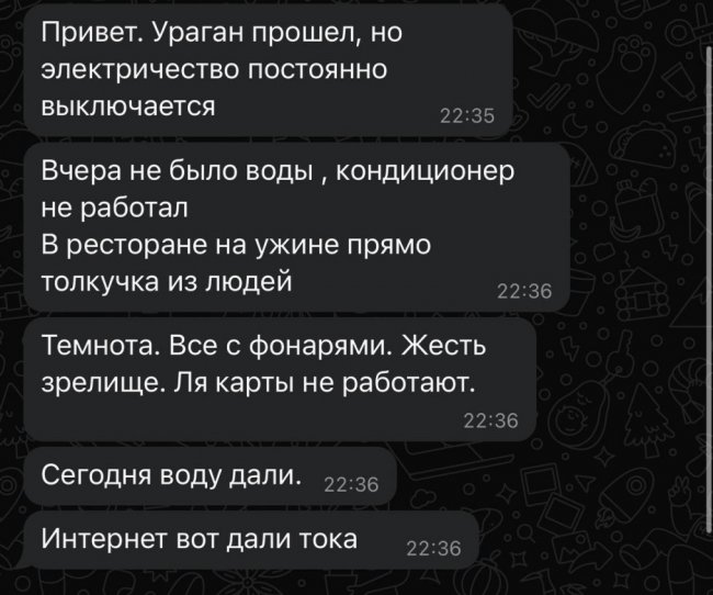 Погода на курортах после прошедшего урагана наладилась Фото: PxHere Туристам в некоторых гостиницах на кубинских курортах пришлось испытать сложности из-за последствий урагана «Рафаэль», пронесшегося над Островом свободы накануне выходных. Один из турагентов, подписчик тг-канала «Крыша ТурДома», сообщил нам со ссылкой на своих клиентов, отдыхающих в отеле Playa Vista Azul 5* (Варадеро), что в гостинице наблюдались перебои с водоснабжением, а также с электричеством – кондиционеры не работали. Были закрыты рестораны a la carte, из-за чего в основном ресторане скапливались очереди на ужин. А в чате по Кубе замечен сигнал от отдыхающих в другом отеле курорта Варадеро, Sol Palmeras 4*. Там во время отсутствия света включали электрогенераторы, но так как в бунгало их использовать было невозможно, гостей переселяли в капитальный корпус, а многих «перевезли на автобусе в другую гостиницу», пишут туристы. Сейчас погода на кубинских курортах благоприятна для отдыха. По прогнозу, на ближайшие дни возможны лишь кратковременные дожди, температура воздуха 27. 29 днем и 24. 26 градусов ночью. Ранее мы писали, что после циклона «Оскар», прошедшего над Кубой в середине октября, в стране целую неделю были перебои с электричеством. Кубинские власти пообещали, что увеличат закупки генераторов для отелей на случай блэкаутов.