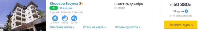 Например, отправившись из российской столицы авиакомпанией S7 26 декабря, обратно – 31-го можно провести 5 ночей в гостинице Kleopatra Bavyera 3* (Аланья). Стоимость тура – 50,3 тыс. руб. (25 тыс. руб. на человека) при двухместном размещении, завтраки включены (здесь и далее указаны цены, актуальные по состоянию на 19:00 24 декабря. – Ред.). Подтверждение бронирования у туроператоров моментальное – ответа от отеля о наличии свободных номеров ждать не придется.
