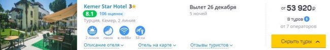 53,9 тыс. руб. на двоих (27 тыс. руб. с человека) достаточно, чтобы отдохнуть в те же даты в Kemer Star Hotel 3* на курорте Кемер. Обратный рейс из Турции доставит туристов в Москву 31 декабря в 19:10, жителям столицы достаточно времени, чтобы успеть вернуться домой к встрече Нового года.