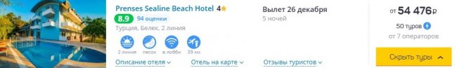 А за 54,4 тыс. руб. за двоих можно купить пятидневный тур в отель категории 4* на курорте Белек – Prenses Sealine Beach.