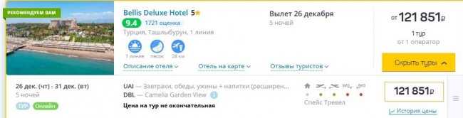 Туры из Москвы реально купить за 25 тысяч рублей с человека Фото Unsplash На сайтах онлайн-тревел-агентств замечены выгодные по цене варианты отдыха в Турции в оставшиеся до Нового года дни с перелетами из Москвы регулярными рейсами. Например, отправившись из российской столицы авиакомпанией S7 26 декабря, обратно – 31-го можно провести 5 ночей в гостинице Kleopatra Bavyera 3* (Аланья). Стоимость тура – 50,3 тыс. руб. (25 тыс. руб. на человека) при двухместном размещении, завтраки включены (здесь и далее указаны цены, актуальные по состоянию на 19:00 24 декабря. – Ред.). Подтверждение бронирования у туроператоров моментальное – ответа от отеля о наличии свободных номеров ждать не придется. 53,9 тыс. руб. на двоих (27 тыс. руб. с человека) достаточно, чтобы отдохнуть в те же даты в Kemer Star Hotel 3* на курорте Кемер. Обратный рейс из Турции доставит туристов в Москву 31 декабря в 19:10, жителям столицы достаточно времени, чтобы успеть вернуться домой к встрече Нового года. А за 54,4 тыс. руб. за двоих можно купить пятидневный тур в отель категории 4* на курорте Белек – Prenses Sealine Beach. В зимний сезон туристы могут в разы дешевле, чем летом слетать на отдых и в люксовые турецкие «пятерки». Например, турпакет в Bellis Deluxe Hotel 5* (Белек) для двоих в 121,8 тыс. руб., причем с питанием ultra all inclusive. Как правило, наибольшее снижение цен приходится именно на предновогодние даты, так как спрос на туры с возвращением до зимних праздников обычно относительно невысок: отельерам, авиакомпаниям, туроператорам приходится стимулировать его спецпредложениями. Отели, принимающие гостей круглогодично, переходят на зимние концепции отдыха. Выбор анимационных и развлекательных программ обычно скромнее, чем летом (конечно, это не относится к высоким новогодним датам), часть ресторанов и баров на территории может быть закрыта. Вода в море уже холодная для купания, но в гостиничных комплексах высокого уровня можно пользоваться подогреваемыми бассейнами.
