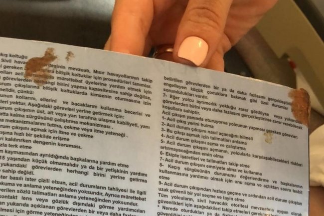 Как сообщил путешественник порталу «URA.RU», поднявшись на борт самолета Airbus 330 после 7-часовой задержки вылета, туристы оказались в ужасе. И судя по фотографиям, предоставленным порталу, пассажиров «Atlasglobal» можно понять: на подлокотниках присохшие жевательные резинки, огромные пятна на сиденьях, а также заляпанные информационные карточки – все это очевидно говорит о том, что российским туристам на этом борту не рады.
