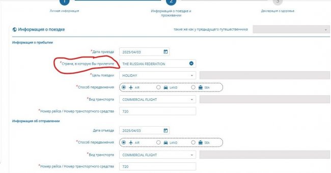 На втором шаге «Информация о поездке и проживании» вызывает вопросы пункт «Страна, в которую вы прилетите»: выбрать очевидный вариант «Таиланд» не получается. А графу «Способ передвижения» зачем-то предлагается заполнить дважды, указав номер авиарейса.