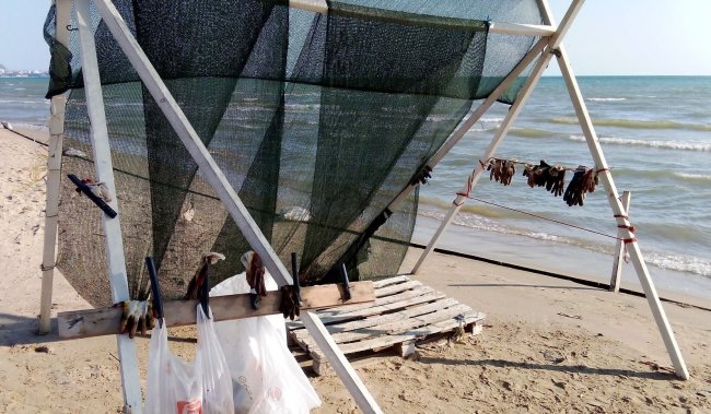 На берегу о произошедшей экологической катастрофе, вызванной затонувшими танкерами, напоминал защитный вал из песка, накрытый сеткой. Также вдоль кромки воды тянулся свитый из полипропиленовой сетки канат – для сбора сгустков мазута. В воде и на прибрежном песке его следов не было видно. О том, что нефтепродукты иногда выбрасывает на берег, свидетельствовали измазанные перчатки, оставленные теми, кто чистил пляж.