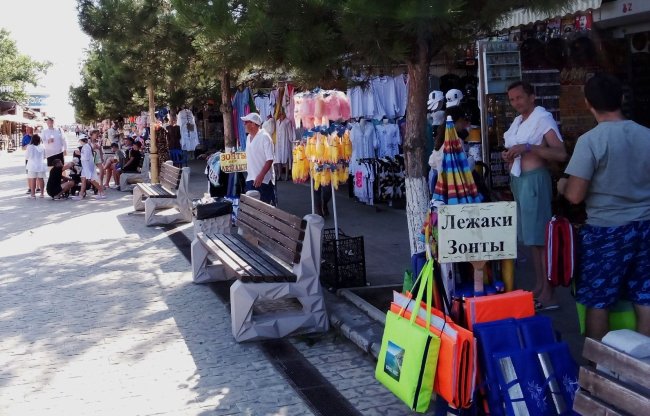 На Пионерском проспекте в Джемете одно из обычно оживленных мест – район между Первым проездом и Морской улицей. Сейчас на самом проспекте часть магазинов и кафе закрыта, в некоторых из них идут ремонтные работы. В тех, что открыты, клиентов очень мало. Продавцы лишь огорченно вздыхали на вопросы, как идут дела. На этих двух улочках, что ведут к морю, практически все торговые точки оказались под замком – из нескольких десятков палаток лишь в 5–6 предлагали сувениры, пляжную одежду и сладости.