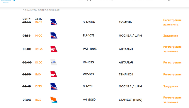 Порядка двух десятков бортов, ожидавших открытия неба с вечера, уже улетели с задержками от 4 до 7 часов. Сейчас на вылет отстают от расписания 40 рейсов. И здесь отдельные задержки значительно больше, чем на прилет, поскольку их выполнение зависит от прибытия воздушных судов, ожидавших снятия «ковра» в аэропортах вылета или на запасных аэродромах. Например, на 17 часов позже отправятся домой туристы из Тюмени – вылет SU2976 за 23 июля назначен на 16:05 сегодняшнего дня. На 5,5 часа позже улетит A4-5069 в Стамбул, на 5 – в Анталью WZ-4003 и IO-1825, на 4,5 часа – UJ-953 в Шарм-эль-Шейх, WZ-557 – в Тбилиси. Тех, что отправляют вовремя, единицы – например, FV-6751 в Анталью.