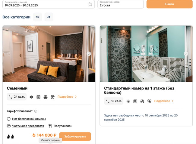 В Riviera hotel 4* комфортные номера есть только на последнюю декаду сентября: варианты с балконом и полным пансионом начинаются от 74,5 тыс. руб.