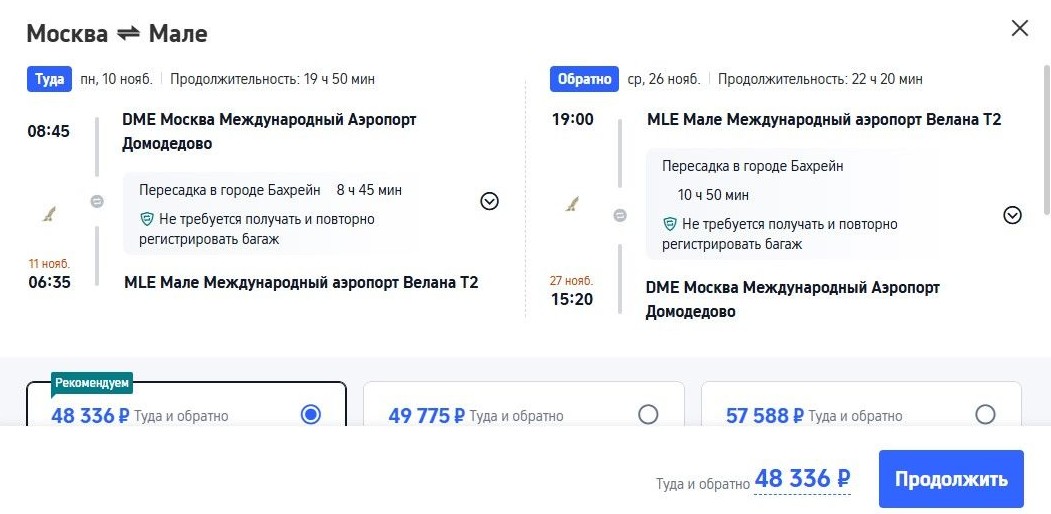 Пересадка в Бахрейне на пути в Мале составит около 9 часов, на обратном маршруте – 11 часов.