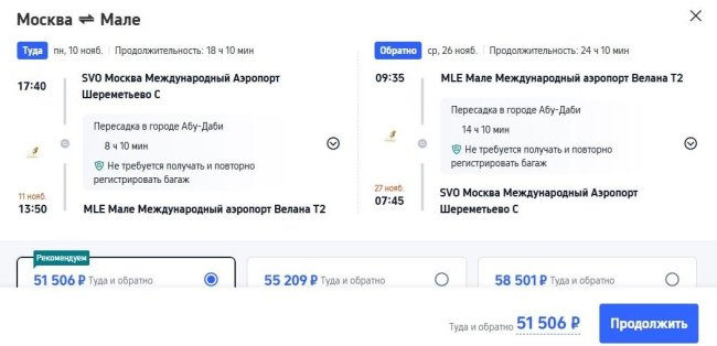 В те же даты можно не менее бюджетно слетать на Мальдивы авиакомпанией Etihad Airways – за 51,5 тыс. руб., правда за перевозку чемодана придется доплатить 3,5 тыс.
