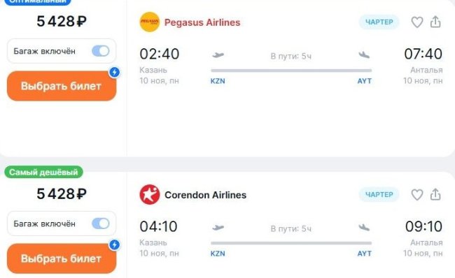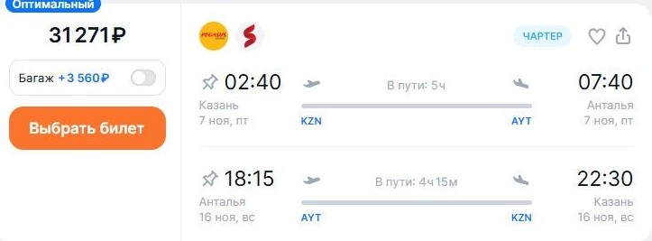 А вот на перелетах round trip сэкономить вряд ли получится. Например, на самой доступной по цене комбинации рейсов из Казани в Анталью 7 ноября авиакомпанией Pegasus, 16-го обратно на Southwind, места обойдутся в 31,2 тыс. руб. – в 6 раз дороже, чем в одну сторону. Кроме того, 3,5 тыс. руб. придется доплатить за багаж.
