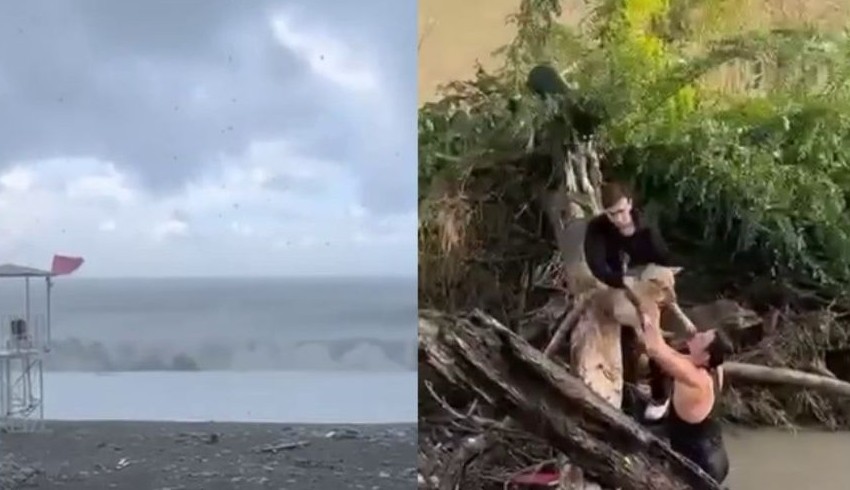 В соцсетях с утра отметили, что рядом с городом-курортом наблюдали мощные облака с зарядами ливня. В то же время над Адлером и Сириусом было солнечно. На пляжах висят красные флаги, на некоторые участки берега волны выбросили деревья и мусор, попавший в море вместе с паводком после прошедших накануне дождей.