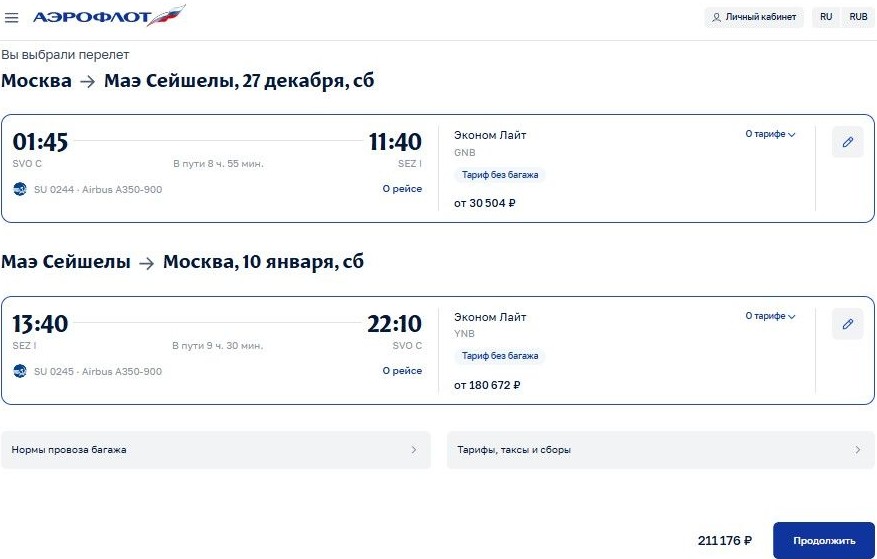За ту же сумму можно слетать на Сейшелы на более короткий период – до 3 или до 5 января. А вот билеты с возвращением в конце зимних праздников, 10 января, обойдутся более чем втрое дороже: 211 тыс. руб. без учета перевозки чемодана.